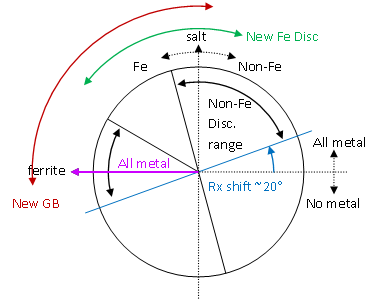 b) Next, the Fe discrimination will get rotated to the left where it belongs. It will enable notching of stainless steel, foil and nickels as well. green