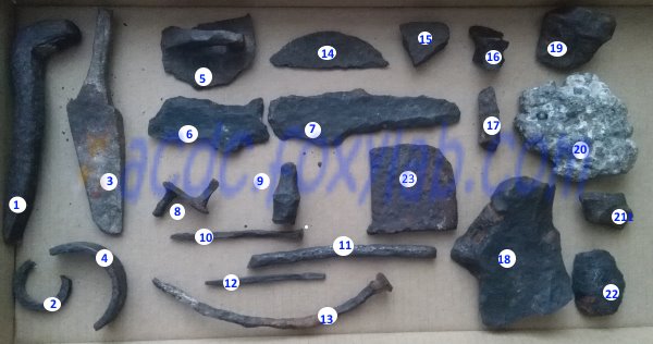 There, many objects are of interest to me - a forged handle (5), a strange forged cone with a thread on the base (9), a circle segment (14), the remains of a knife (?) (6,7), an element of an agricultural implement (?) (2) , a massive piece ( 18 ) , similar to a fragment of a shell / mine / bomb, but with artificial recesses inside ...