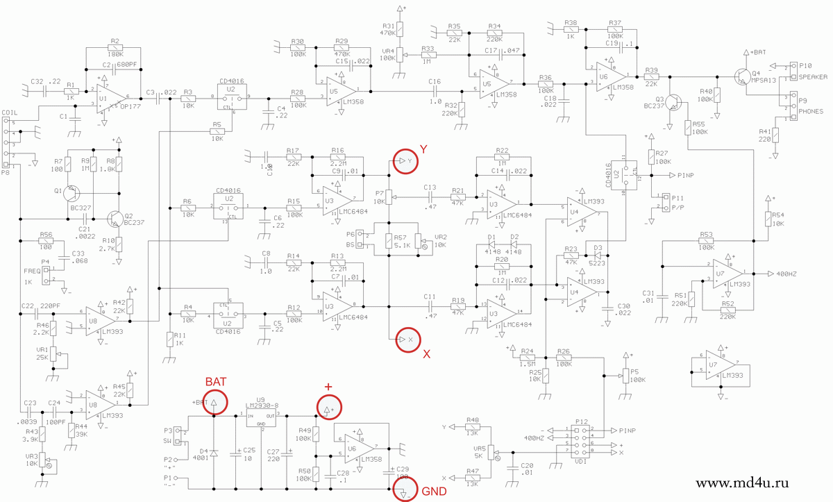 Hello Silverdog, If connected to power no more then 50-75 mA ? There is +8V on U1/7 and ca.-8V on U1/4 ? If you connect the tx coil on the board you have a good signal ? Can you check this with a scope ? If you have a good TR signal then check the signal at the unconnected receive wire from the coil... must be a signal from some mV's and response if you move metal under the coil If you have receive signal that is responding to metal then connect the receive wire's to the board. Now look if you have the same "un connected" signal at U1/3 if so then look at U1/6. You must see a larger signal at U1/6 then on U1/3 .. If no signal replace U1, if small signal check the parts R2-C2-R1-C32. If no success.. disconnect C3 and look again. Check also C1... that cap is also the one you need for adjusting the tr/rec. freqs... look at the output U1/6 if you chance C1.