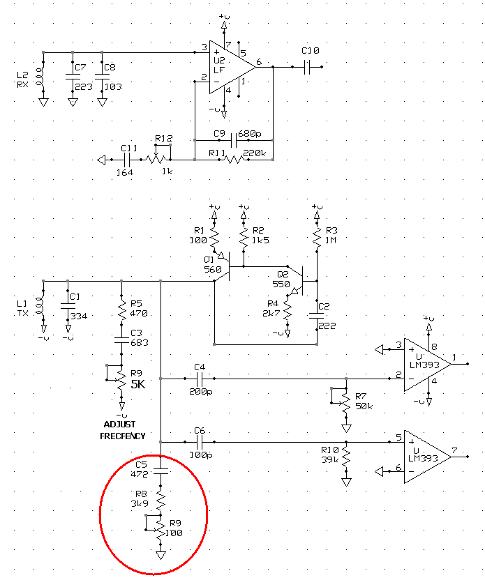 The same idea pop up in my mind right after Ivconic mentioned the importance of one of the trimmers for the depth. On one hand, few weeks ago I did some experiments with buried small coin (18mm diameter on 22sm in the ground), and noticed that rotating above the target there are directions/approaches when was heard unequivocal and definite reaction, and continuing the movement around the target in a circle there were moments, when the detector discriminated it partially. These two facts provoked me to check this kind of schematics in my archives, and it was confirmed that in most cases the component you have encircled in red is trimmer instead of constant resistor. I hadn't been paying attention on that so seriously, even though, back in time, I`ve repaired detector based on that sch solution, and there definitely was trimmer, because I`d redrawn back its schematic from the PCB. So, I definitely will play with that issue during some of the next weekends, as to confirm or dispel doubts on the matter (Moreover, the coin is still in the ground and is waiting to be found easily and clearly)
