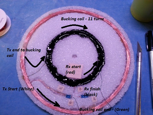 The Tx coil is made on a separate former and held together with Cyan glue. Then this coil is simply glued into a channel cut into the foam. The bucking coil is wound opposite the direction of the Tx coil - directly on top of the Rx coil.
