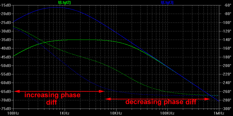 Attached is the simulation. Maybe I'm not doing the right sim, or maybe its not true to life. But interesting. I'm still not clear why the phase difference gets smaller with really high frequencies; need to dig into the sim.