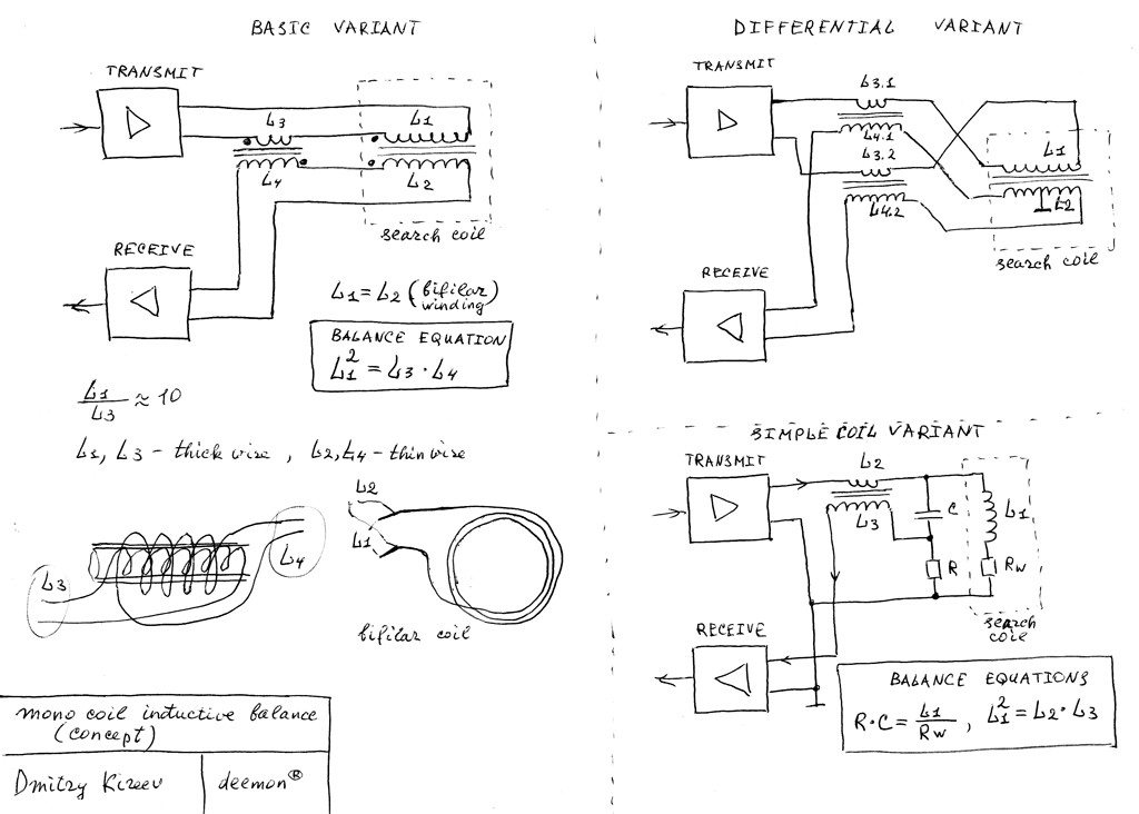 And many times I thought how can I separate transmit and receive signals using only one coil ? Of course there are some well-known solutions like Wheatstone bridge , for instance .... but the same problem with them is need to simultaneously balance two parameters - coil inductance and coil wire resistance . Inductance is not a big problem , but resistance of a copper wire is thermal dependent parameter , and balance will go away with every temperature change . Another thing that I don't like in those circuits is need to use several precision components in the bridge . But the circuit that I talking about doesn't have this problem and also is extremely simple . What we need is to wind a usual round coil , the same kind that we use in well-known PI devices , but with 2 bifilar wires ( thin and thick ) and connect them to the simple transformer wound on the little bobbin - we can place in near the printed circuit board of our MD . As we can see on the picture , balance equation does contain 3 inductances but no resistors at all , so we need to balance only one parameter and doesn't have a problem with thermal drift of the wire resistance . So I made some experiments with a real coils and found that this circuit really works and gives a good balance . In order to simplify a balance procedure I used a little and thin ferrite stick that I move into the compensation transformer bobbin . By the way , we can use this circuit in the multiple-frequency IB detectors or even in PI-IB devices . As for me , I have a plan to make a multi-frequency IB device with very interesting algorithm , using this balance circuit . But it needs some time to think about ...