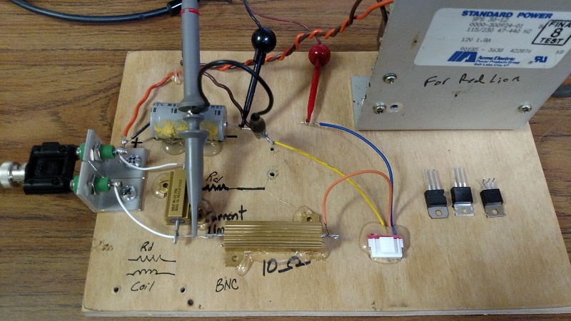 I wanted to test all the coils I have laying around so I thought I would put this rig together with spare parts I had on hand. It is a 12v power supply, a 500 ohm damping resistor,and a 10 ohm series resistor,I found a connector that a t0220 transistor would plug into so I could swap switches and compare. pardon the scribbles on the plywood I tried several different configurations. Im pulsing the switch with a function generator.I would like to get some multi tap switches and build a couple resistor decades,or substitutions to vary the resistances.I just dont trust a pot for the amps that are flowing in this circuit. One problem I found with this is the power supply is not isolated,so the scope probe ground doent want to connect to +12volt dc,so all measurements are taken from ground. Thats a problem when you want to zoom in on your waveform dc coupled.So maybe a battery pack is in order.