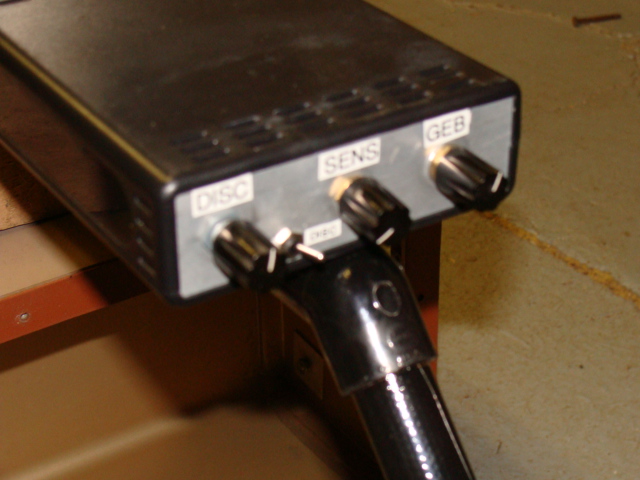 Power is two nine volt batteries under the armrest. In retrospect the detector would have balanced better if I had used a 12 volt pack of AA cells and just accepted the added weight. (About 3 1/4 oz difference)