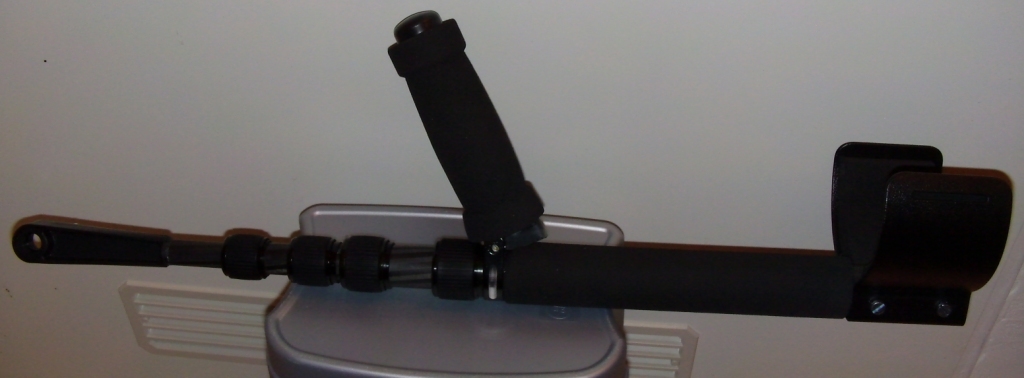 The housing for the control box is from a junk DC to AC converter. Armrest is cut from 4 inch diameter thin wall aluminum irrigation tubing. Shaft for armrest is a piece taken from a spring loaded shower curtain arm. The 45 degree elbows are 3/4 inch PVC fittings. The tubing OD is 3/4 inch and fits so tight that I used PVC cement as a lubricant to enable seating the tubing all the way. Once set, I can not move them. The upper shaft is from a weed eater. The lower shaft is from a wood broom handle turned to fit the tubing and sanded square at the ends to fit the coil. Bolt is from a toilet bowl lid. Cable is from an old USB device.